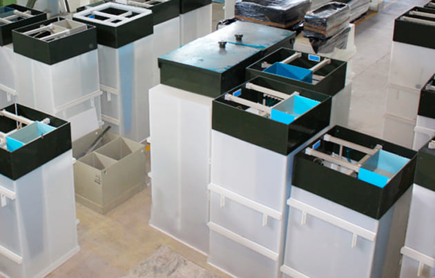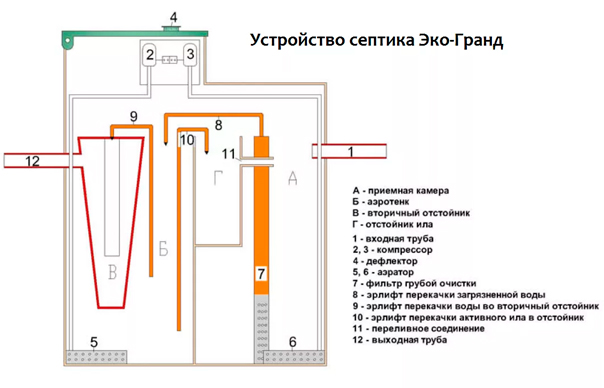 Система для очистки Эко-Гранд — это прочный прямоугольный или квадратный резервуар из полипропилена. Он разделен на 4 камеры, в которых находится все необходимое для очистки оборудование: специальные струйные насосы, компрессоры, аэраторы и др. Внутри каждой из камер происходит отдельный этап процесса очистки. Сверху у септика находится утепленная герметичная крышка, в которую вставлен дефлектор, через который проходит воздух. Подсоединить септик к трубопроводу очень просто, а сбрасывать очищенные стоки можно в накопительную емкость (для последующего полива огорода), в специальную канаву или просто на землю. Функционирует система без откачки, необходимо лишь систематически производить профилактические работы.